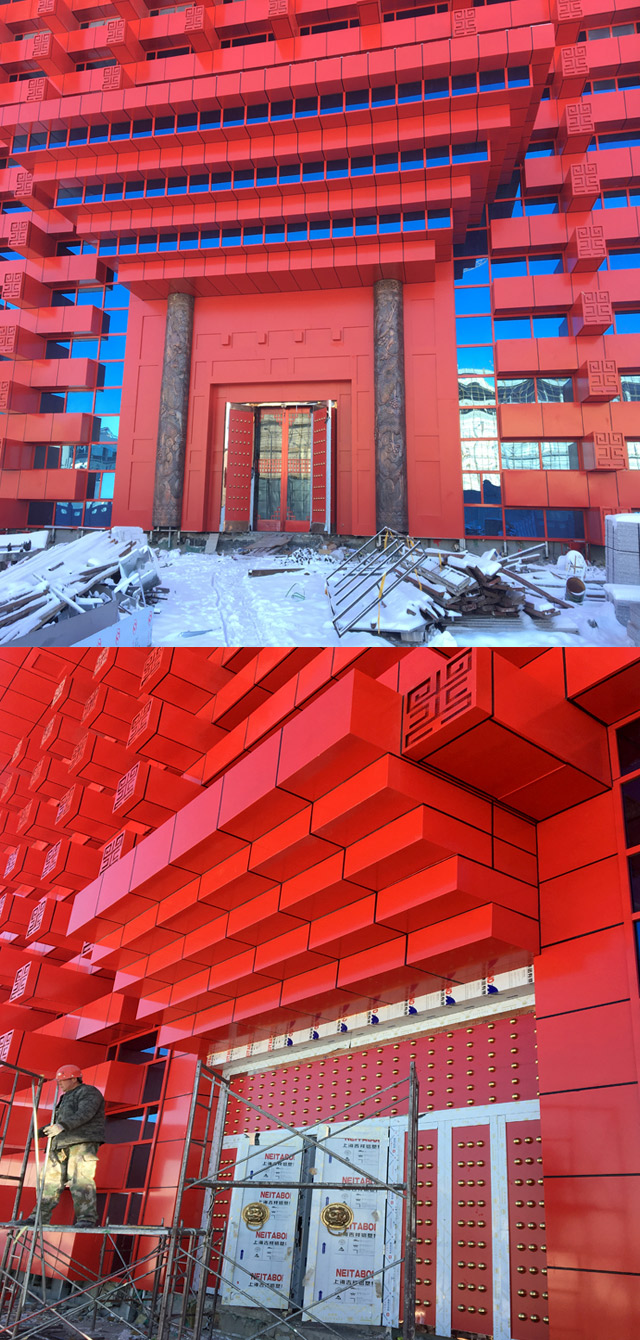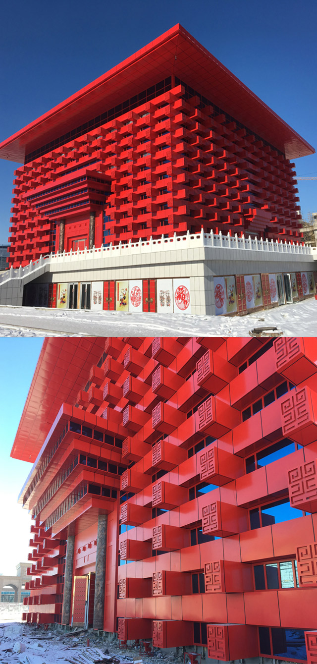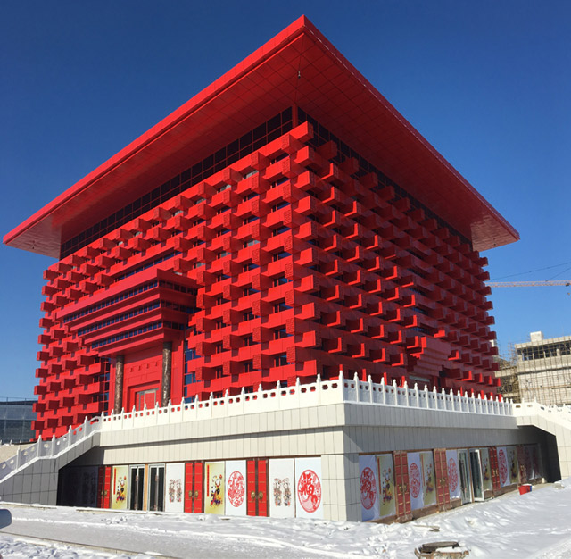 新疆霍爾果斯中國文化館項目采取PPP運作模式,總投資1.29億元,2015年7月開建,今年5月建成投入試運營。該建筑為地上四層,地下一層,一層主要功能為展覽及商鋪,二層為中國文化展示,三、四層為演藝及會議,整個展館在外形設計上以宏偉、舒展,縱橫交錯的紅色線條體現出濃重的中國元素,很容易讓人聯想到上海世博會中國館。