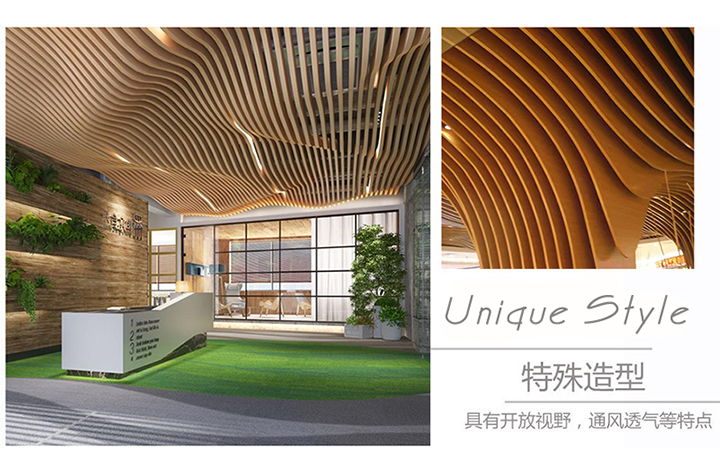 1、造型鋁方通產品造型多樣,美觀典雅;可靈活調節上部空間的視覺高度;