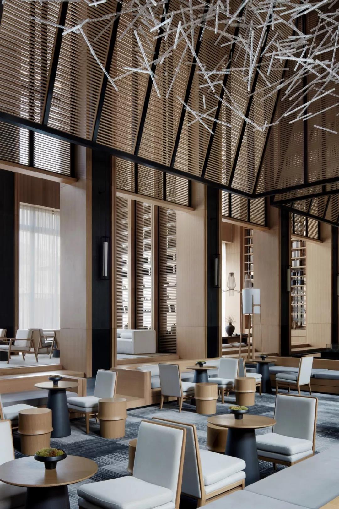 木色材質的運用,營造安靜溫暖的心靈療愈氛圍;灰色原石,莊重沉穩,透露出真實的天然質地;縱向立面木質格柵,讓空間隔而不斷,相互滲透,顯示出樸素而純粹、獨特而清雅的精神氣質。